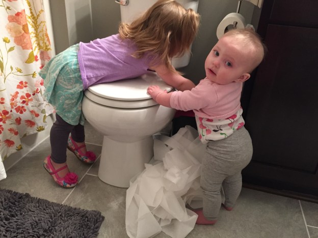Pictured above is a prime example of the quick catastrophes that are the result of said “bathroom mischief”!  Evy was 2, and Isla was 1 yr in this photo. An incident like this a few months back resulted in a plumber, Roto-Rooter, and city Public Works crew unclogging a blockage that backed up the sewer system that connected to our neighboring street. I thank God and the generosity of city crews in our town that fixed the whole mess.  I will never take any of these professions for granted. Ever! Again!